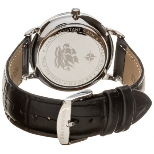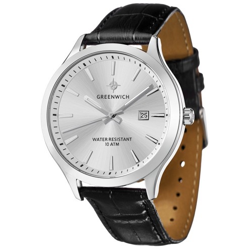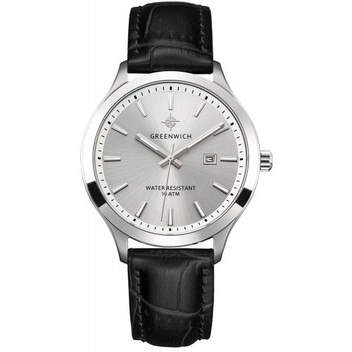 Мужские часы серии Helm – одна из самых популярных моделей марки Greenwich. В часах установлен надежный японский механизм. Корпус часов изготовлен из нержавеющей гипоаллергенной стали. Посередине боковой части корпуса выполнена специальная полировка – вертикальное матирование, что визуально делает корпус тоньше. Размер корпуса 42. Стальной циферблат смотрится глубоким и объемным, благодаря «колодцу» по внутреннему краю с нанесенной секундной разметкой. Полировка на циферблате выполнена в стиле солнечных лучей. Индексы часов изготовлены вручную в виде трапеций и закреплены на двух штифтах. На часовую, минутную стрелки и индексы нанесено люминесцентное покрытие, что позволяет определять время в темноте. Часовая и минутная стрелки имеют мечеобразную форму. Это делает их объемными и хорошо читаемыми. Циферблат надежно защищен минеральным стеклом. Водонепроницаемость часов – 10 АТМ, что позволяет заниматься в них водными видами спорта. Завинчивающаяся задняя крышка обеспечивает данный уровень защиты от воды.